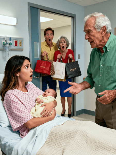 Before he could respond, the door burst open. My husband, Mark, and my mother-in-law, Vivian, walked in loaded down with shiny shopping bags stamped with luxury logos—brands I could barely afford to look at. They claimed they had just been “running a few errands.” Their voices were bright and carefree… until they noticed my grandfather sitting beside my bed.